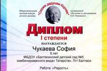 К.И.Чуковский тууына 140 ел тулу уңаеннан "Корней бабай әкиятләре" Төбәкара читтән торып үткәрелгән рәсем конкурсында Чукаева София 1 дәрәҗәле диплом белән бүләкләнде. "Радость" эше. Педагог: Хафизова Фарида Фирдависовна