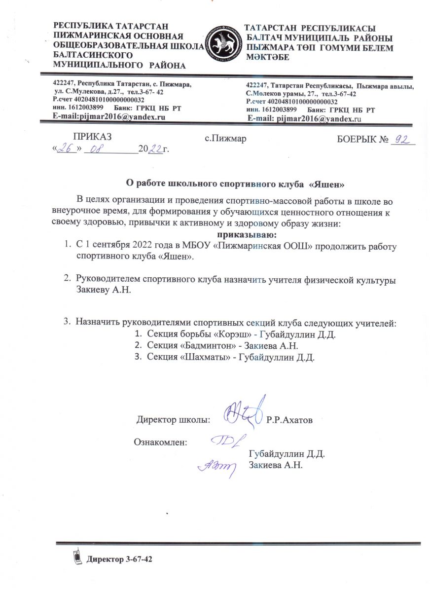 Адрес: 422247, РТ, Балтасинский район, с. Пижмара, ул. Мулекова, д. 27