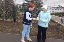 Раздача листовок на улице села, с описанием истории праздника День народного единства