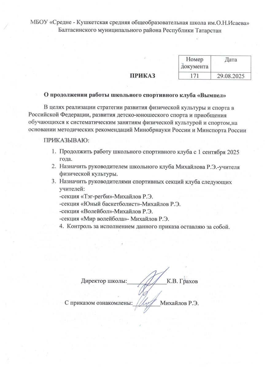 Приказ о продолжении работы школьного спортивного клуба