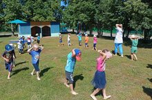 Бакчабызда шәфкать туташы Гүзәлия Закариевна сәләмәтлек гимнастикалары үткәрә.Балалар бик теләп чирәмдә һәм сәләмәтлек сукмагында яланаяк йөриләр.