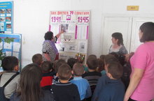 Бөек Җиңүнең 70 еллыгы уңаеннан экскурсия вакытында Салавыч авылы клуб мөдире Фирая Зиганшина зурлар - мәктәпкә әзерлек төркемен сугыш тарихы батырлары белән таныштырды стенд күрсәтте.