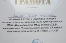 Гилязов Раниль Фаритович занял место в районном конкурсе водительского мастерства среди преподавателей ОБЖ "Преподававтель ОБЖ - знаток ПДД", посвященного 75 - ой годовщине победы в Великой Отечественной войне и 100 - летию ТАССР
