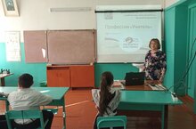 Укытучы- остаз Гарифҗанова Н.Ф. 5-6 сыйныфларда профориентация көне кысаларында укытучы һөнәренең асылы турында сөйләде./ Учитель-наставник Гарифзянова Н.Ф. рассказала о сути профессии учителя в рамках дня профориентации в 5-6 классах.