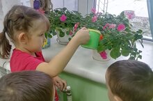 В детском саду дети учатся трудовым навыкам. Помогают ухаживать за комнатными растениями, закрепляют умение поливать цветы из лейки.