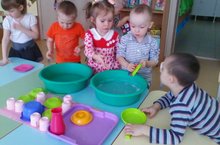 На занятии "Ознакомление с предметным окружением" дети младшей группы учатся мыть посуду.