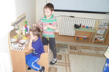 Самат из старшей группы очень любит играть в сюжетно-ролевую игру "Парикмахерская" со своими друзьями.
