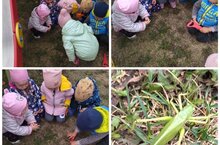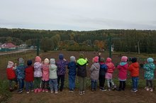 Дети средней группы наблюдают за школьниками как они собирают картошку.