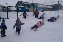 Весело зимой! Можно поваляться в снегу, покататься с горки. Дети группы раннего возраста на прогулке.