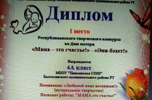 Учащиеся 4-а класса (кл.руководитель: Зарипова А.Б.) и ученица 1-б класса Григорьева М. (руководитель: Григорьева А.И.) заняли I место в республиканском творческом конкурсе видеопоздравлений "Мама - это счастье!" Благодарим учащихся и руководителей за активность и творчество!