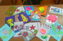 23нче февраль - Ватанны саклаучылар көне уңаеннан, укучылар авылыбызның ир-егетләренә бүләккә открытка ясадылар.
