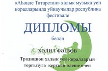 Фәезов Хәлил Рависович “Аһәңле Татарстан “ халык музыка уен коралларында уйнаучылар республика фестиваленең гала концертында гөсләчеләр ансамбле белән катнашып I- нче дәрәҗә лауреат дипломына һәм “Традицион халык уен коралларын торгызуга керткән өлеше өчен” дигән дипломга ия булды.