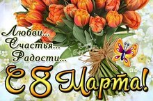 поздравляем вас с Международным женским днем! Желаем вам тепла и любви в сердцах, замечательного настроения и прекрасного самочувствия. Будьте красивы, счастливы, дарите улыбки, радуйтесь и получайте замечательные впечатления. Вы очаровательны! С праздником!