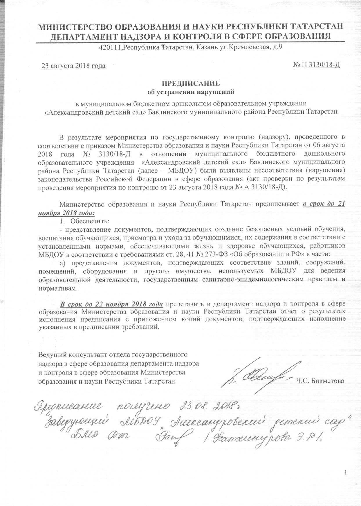 Предписание об устранении нарушений департаментом надзора и контроля в сфере образования 2018г..pdf