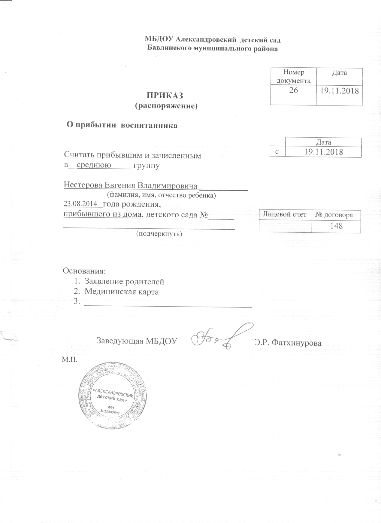 Приказ о прибытии в старшую разновозрастную группу № 26 от 04.09.2019г. 1 воспитанника.bmp