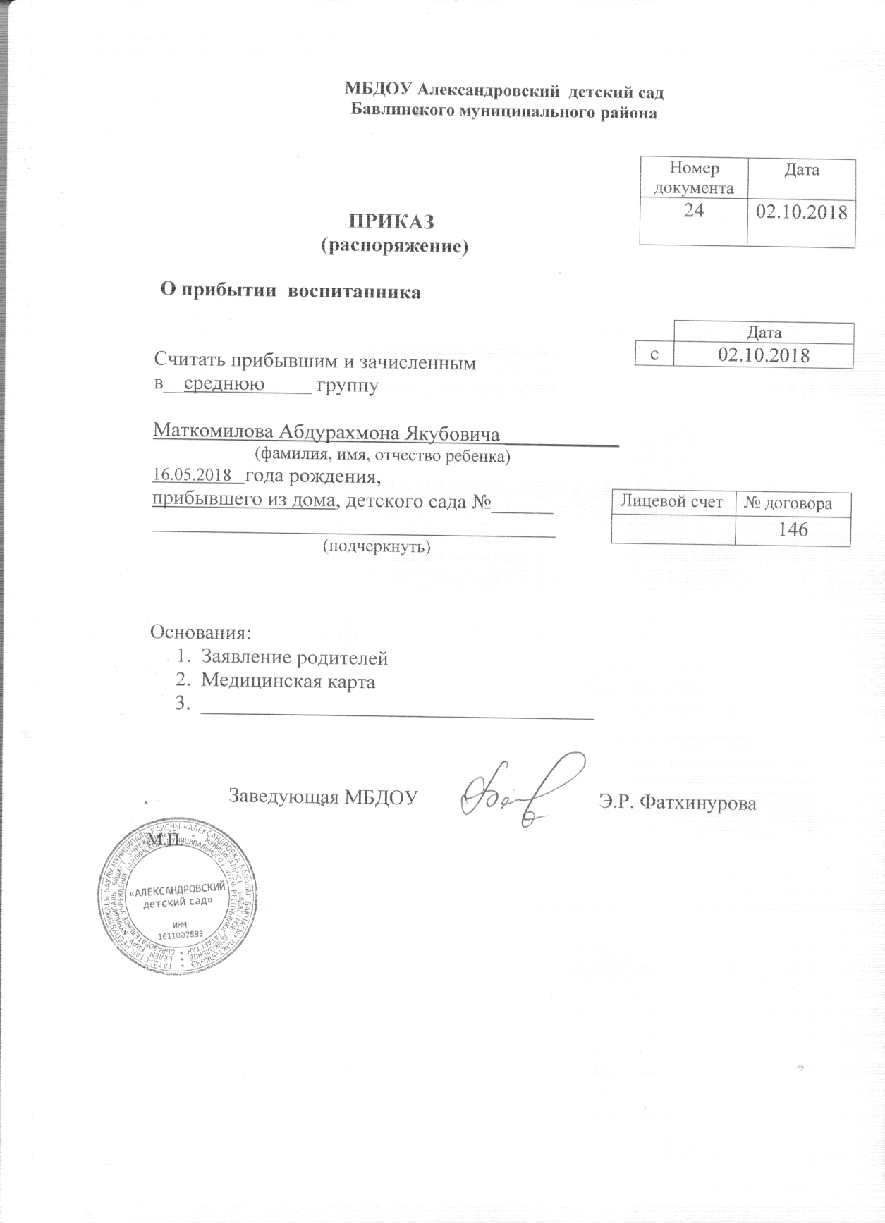 приказ о прибытии в среднюю разновозрастную группу 1 воспитанника № 24 от 02.10.2018г.bmp