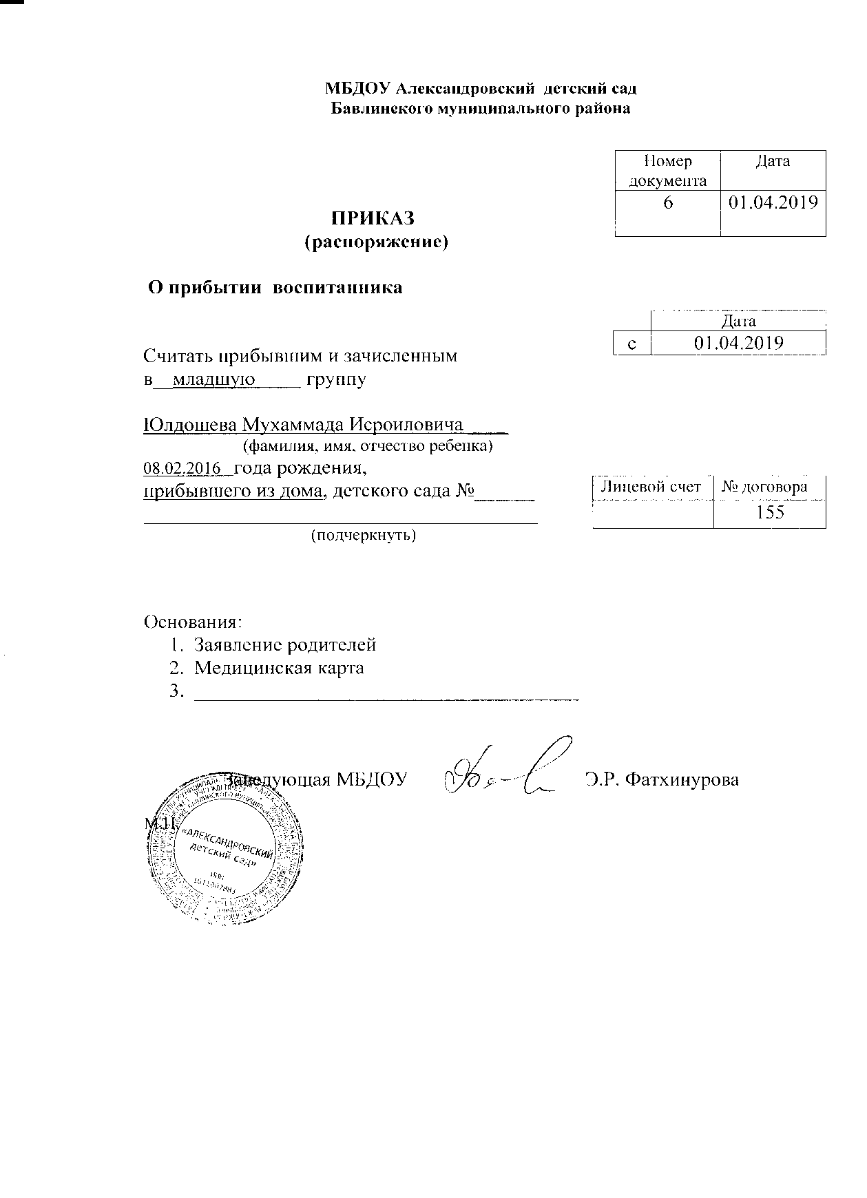 Приказ о прибытии в старшую разновозрастную группу 1 воспитанника № 5 от 01.04.2019г. bmp