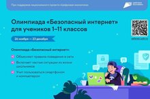 Онлайн-олимпиада продлится до 23 декабря для учеников 1-11 классов. Она направлена на повышение уровня киберграмотности. Школьники смогут проверить и улучшить свои навыки безопасного пользования интернетом и цифровыми устройствами на образовательной платформе Учи.ру.