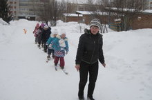 Инструктор по физическому воспитанию Тагирова Румия Анваровна регулярно проводит занятия по физической культуре на улице, отрабатывая технику ходьбы на лыжах в подготовительных группах.