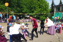 Сегодня на территории нашего детского сада царила праздничная атмосфера. Славный праздник Сабантуй собрал всех ребятишек, чтобы дружно повеселиться и посостязаться в национальной борьбе «Куряш». Аби, пришедшая на праздник, рассказала ребятам о празднике, о том какие национальные игры проводятся на Сабантуе. Ребята же, рассказали ей стихи о празднике, спели песни на татарском языке и станцевали. Шурале и Батыр тоже посоревновались между собой, чтобы определить сильнейшего. В состязаниях «Бег с яйцом», «Бой горшков», Перетягивание каната», «Бег с коромыслом», «Скачки» приняли участие все желающие. Звание главного батыра получил Даниэль Гайфуллин из группы «Колокольчик».