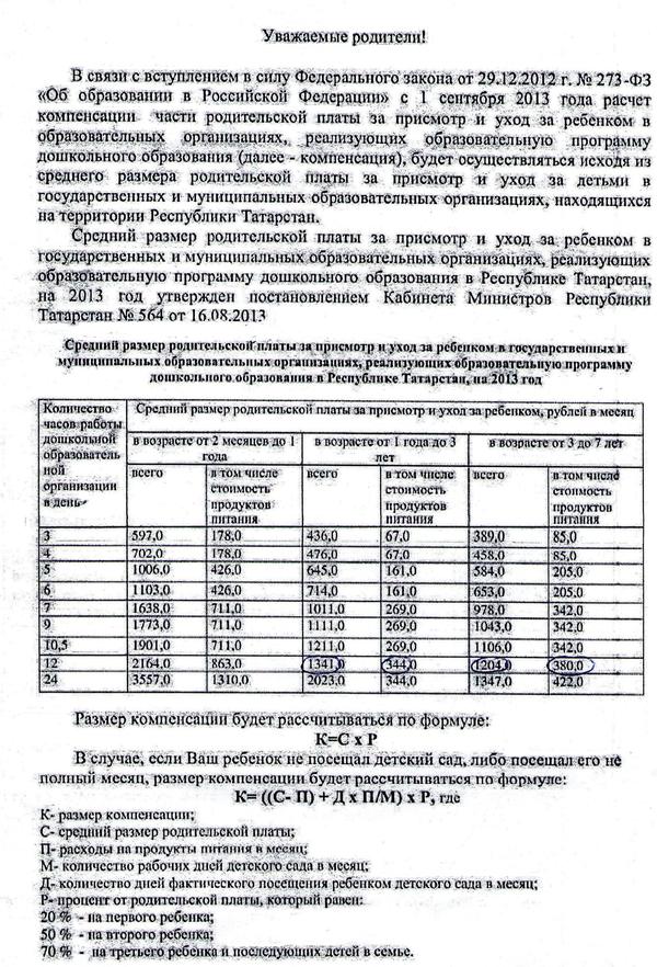 С 1 сентября 2013 года расчет компенсации родительской платы за присмотр и уход за ребенком в образовательных организациях, реализующих образовательную программу дошкольного образования, будет осуществляться исходя из среднего размера родительской платы за присмотр и уход за детьми в государственных и муниципальных организациях, находящихся на территории Республики Татарстан.