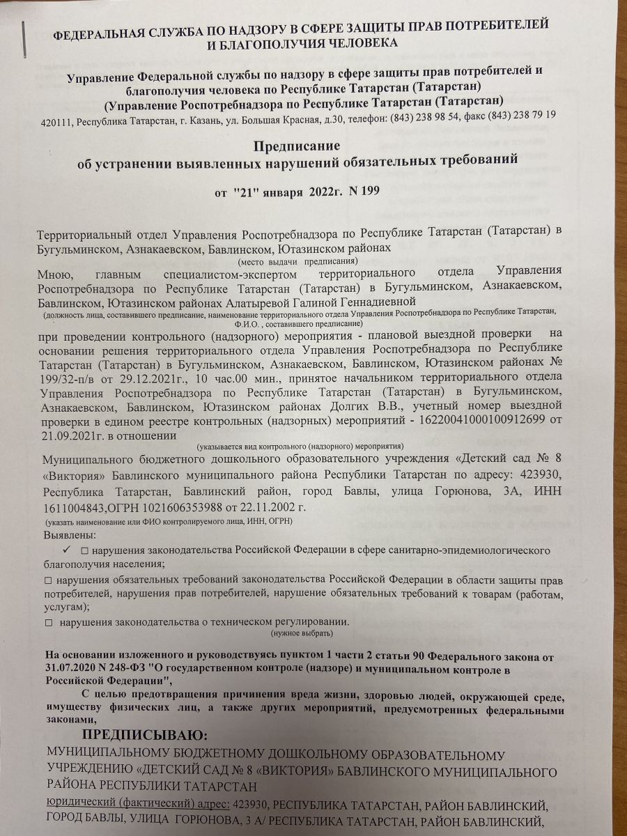 Предписание об устранении выявленных нарушений обязательных требований от 21.01.2022г.