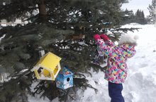 Дети старшей группы развесили кормушки для птиц на территории детского сада.