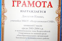 Бөтенроссия Спартакиадасының муниципаль этабында , шашка буенча 2003-2004 елгы укучылар арасында Исергәп урта мәктәбе укучысы Дәүләтов Илназ I урын яулады.