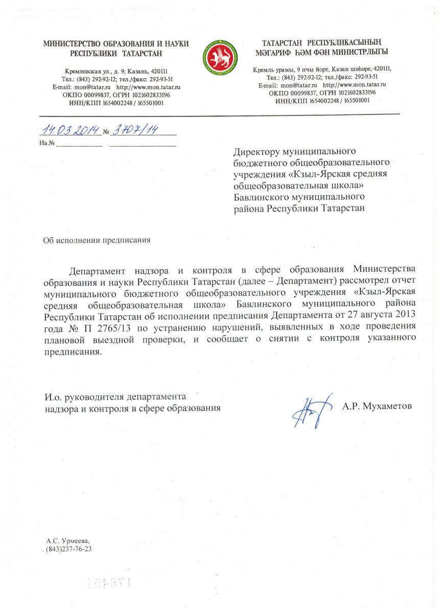 Предписание об устранении нарушений Министерства образования и науки РТ