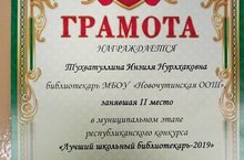 Школьный библиотекарь Тухватуллина Инзиля Нурлхаковна приняла участие в республиканском конкурсе "Лучший школьный библиотекарь -2019" и заняла 2 место в муниципальном туре. Поздравляем!!!