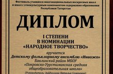 Детский фольклорный ансамбль "Инвожо" при СДК (руководитель Зайдуллина Н.С.) принял участие в фестивале учащихся школ с этнокультурным компонентом содержания образования и получил диплом 1 степени в номинации "Народное творчество". МОЛОДЦЫ!