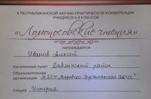 30 марта в г.Набережные Челны прошла республиканская конференция для учащихся 5-8 классов "Ломоносовские чтения". Учащийся 5 класса Иванов А. занял 2 место. Руководитель учитель истории и обществознания Чернов А.А.. Молодцы!!!