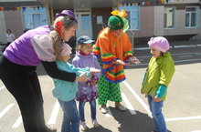 С самого утра детей встречала задорная детская музыка. Выйдя на прогулку дети отправились в сказочное путешествие на волшебном поезде, Первая станция - Спортивная, где дети исполнили зажигательный спортивный танец, Вторая станция - Песенная , Третья станция - Загадочная , Четвертая станция - Рисовальная. Забавные клоуны Ах и Ох сопровождали детей во время всего путешествия и доставили "поезд" с детьми на групповые участки, где воспитатели продолжили радовать детей веселыми играми.
