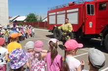 Сегодня прошла встреча дошкольников с сотрудниками пожарной части №14. Пожарный объяснил детям как правильно вести себя при чрезвычайных ситуациях, пользоваться огнетушителем , средствами индивидуальной защиты. Так же детям показали подачу воды с пожарного рукава. В конце встречи дошкольник подарили на память пожарным свои рисунки на тему «Пожар- опасно!!» -