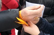 Балалар әниләренең кулларына куе сары тасмалар бәйләделәр.