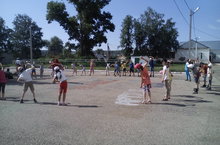 После утренней зарядки, дети соревновались на спортивной эстафете: бег со скакалкой, бег через обруч и ведение мяча одной рукой. После эстафеты ребята играли в футбол.
