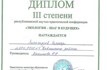 Учащийся 9 класса Ильнар Зиянгареев занял почетное 3 место в республиканской научно-практической конференции "Экология - шаг в будущее".