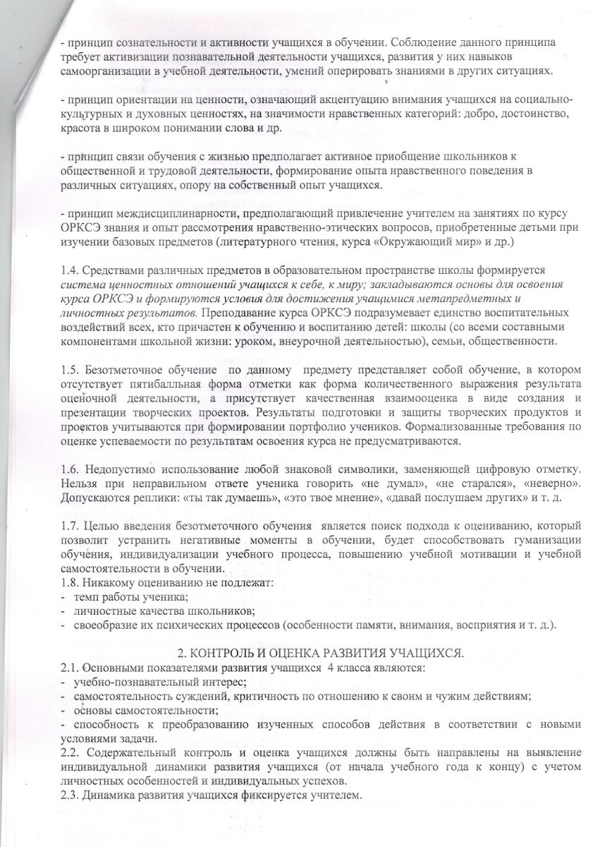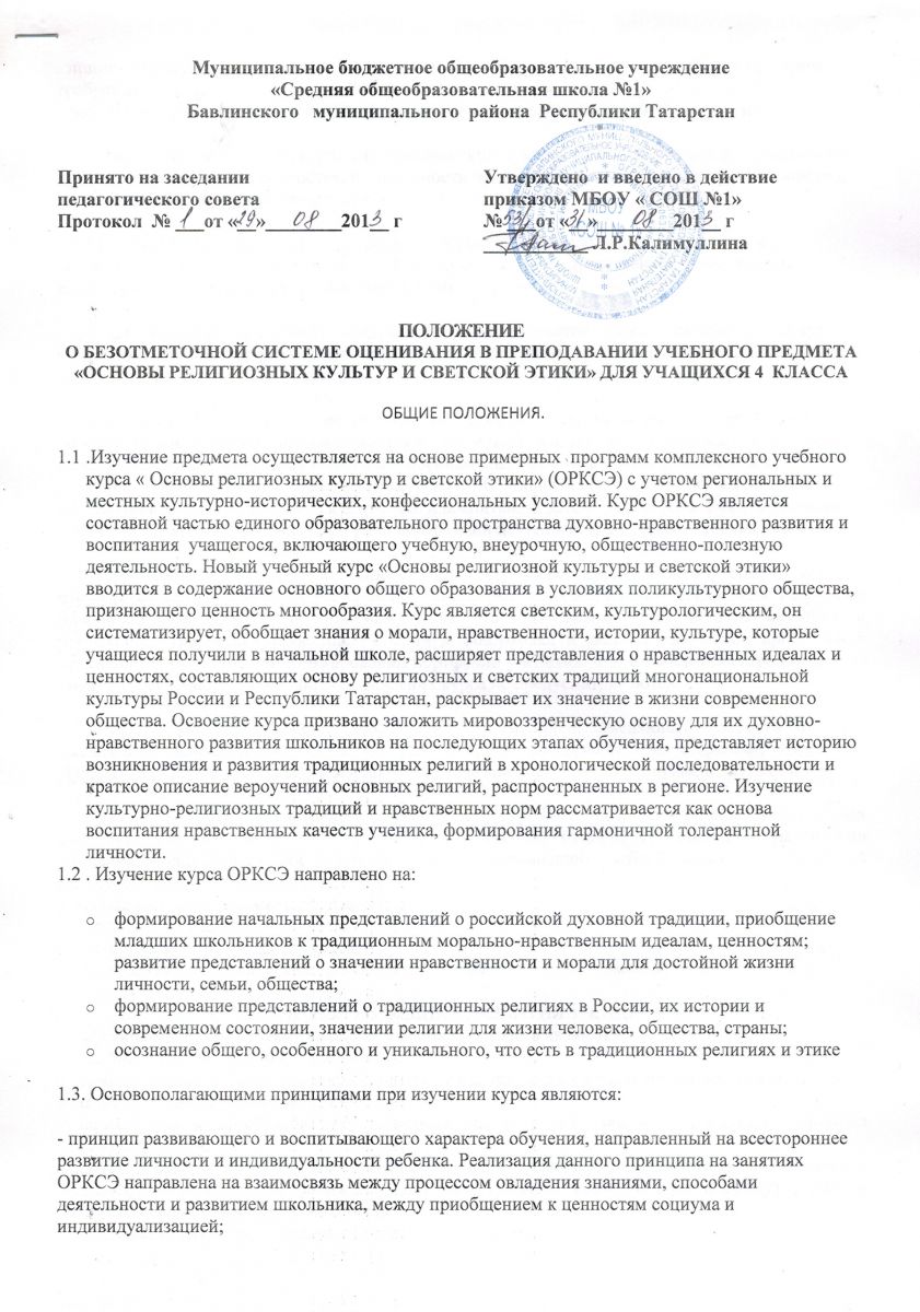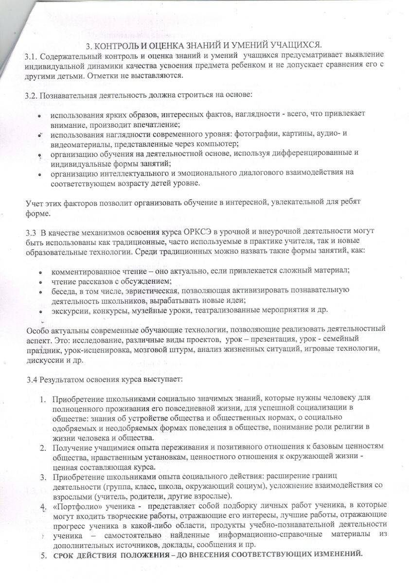 Положение о безотметочной системе оценивания в преподавании уч. предмета "ОРК и СЭ" для 4 класса.
