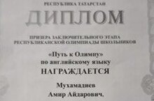 В олимпиаде по английскому языку приняли участие 208 обучающихся из 41 муниципальных районов Республики Татарстан. Из нашей школы принимал участие Мухамадиев Амир, ученик 10 класса, и стал призёром! Поздравляем! Желаем дальнейших успехов!!!