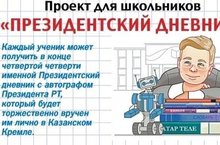 Проект для школьников «Президентский дневник» на самое большое количество пятёрок, полученных в течение IV четверти. Эта совместная акция газеты «Комсомольская правда» в Казани и Министерства образования и науки РТ впервые проходило в Татарстане. Каждый ученик сможет получить в конце года именной Президентский дневник с автографом Президента Республики Татарстан Рустама Минниханова, который будет торжественно вручён им лично в Казанском Кремле.