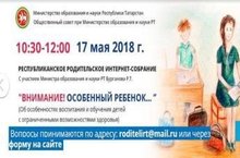 17 мая 2018 года в 10:30 состоится шестое заседание Республиканского родительского интернет-собрания, посвященное особенностям воспитания и обучения детей с ограниченными возможностями здоровья. Данный проект – совместная инициатива Министерства образования и науки Республики Татарстан и Общественного совета при Министерстве образования и науки Республики Татарстан.