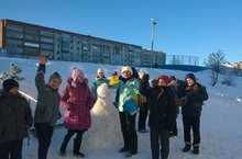 5 А класс дружно слепили фигурку из снега.