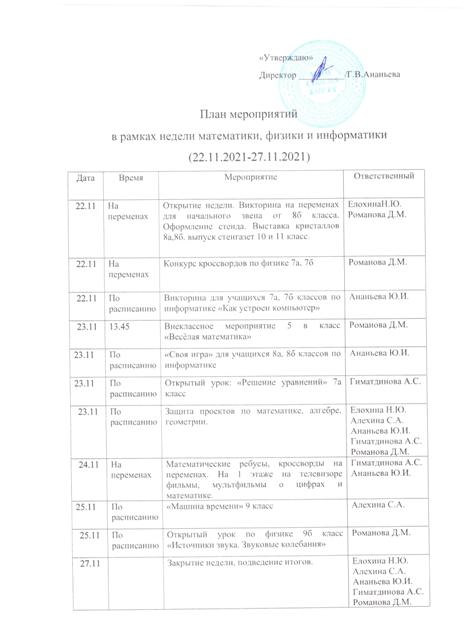 Математика, физика һәм информатика атналыгы кысаларында башлангыч сыйныф укучылары өчен 8 б сыйныф укучылары татлы призлар белән математик викторина үткәрделәр. 7 нче сыйныф укучылары өчен информатика укытучысы Ананьева Ю.И. "Компьютер ничек корылган"дигән викторина үткәрде. Математика укытучысы Гиматдинова А.С. 7 а сыйныфында "Тигезләмәләрне чишү"темасына ачык дәрес үткәрде.