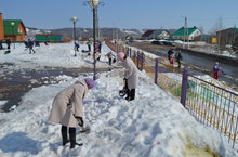 Сегодня учителя вместе с учениками вышли на субботник по очистке территории от снега.