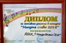 9 нчы ноябрьдә Татар Кандызы урта мәктәбенең укучылары районда үткәрелгән “Минута славы-2018” иҗади конкурсының гала-концертында катнашып җиңү яулап кайттылар.«Вокал-соло» номинациясендә: 4 нче сыйныф укучысы - 3 нче урын«Хореография - ансамбль» номинациясендә: «Йолдызлар» бию коллективы- 2 нче урынТатар Кандызы урта мәктәбе коллективына «Минута славы - 2018» иҗади конкурсының актив катнашучысы дипломы тапшырылды. МОЛОДЦЫ МАЛАЙЛАР!9 ноября учащиеся МБОУ “Татарско-Кандызская СОШ” приняли участие в гала-концерте районного творческого конкурса "Минута славы-2018".В номинации "Вокал-соло": ученик 4 класса занял 3 место.В номинации "Хореография - ансамбль": танцевальный коллектив "Йолдызлар" - 2 место.Коллективу Татарско - Кандызской средней школы был вручен диплом участника творческого конкурса «Минута славы-2018». МОЛОДЦЫ МАЛЬЧИКИ! -