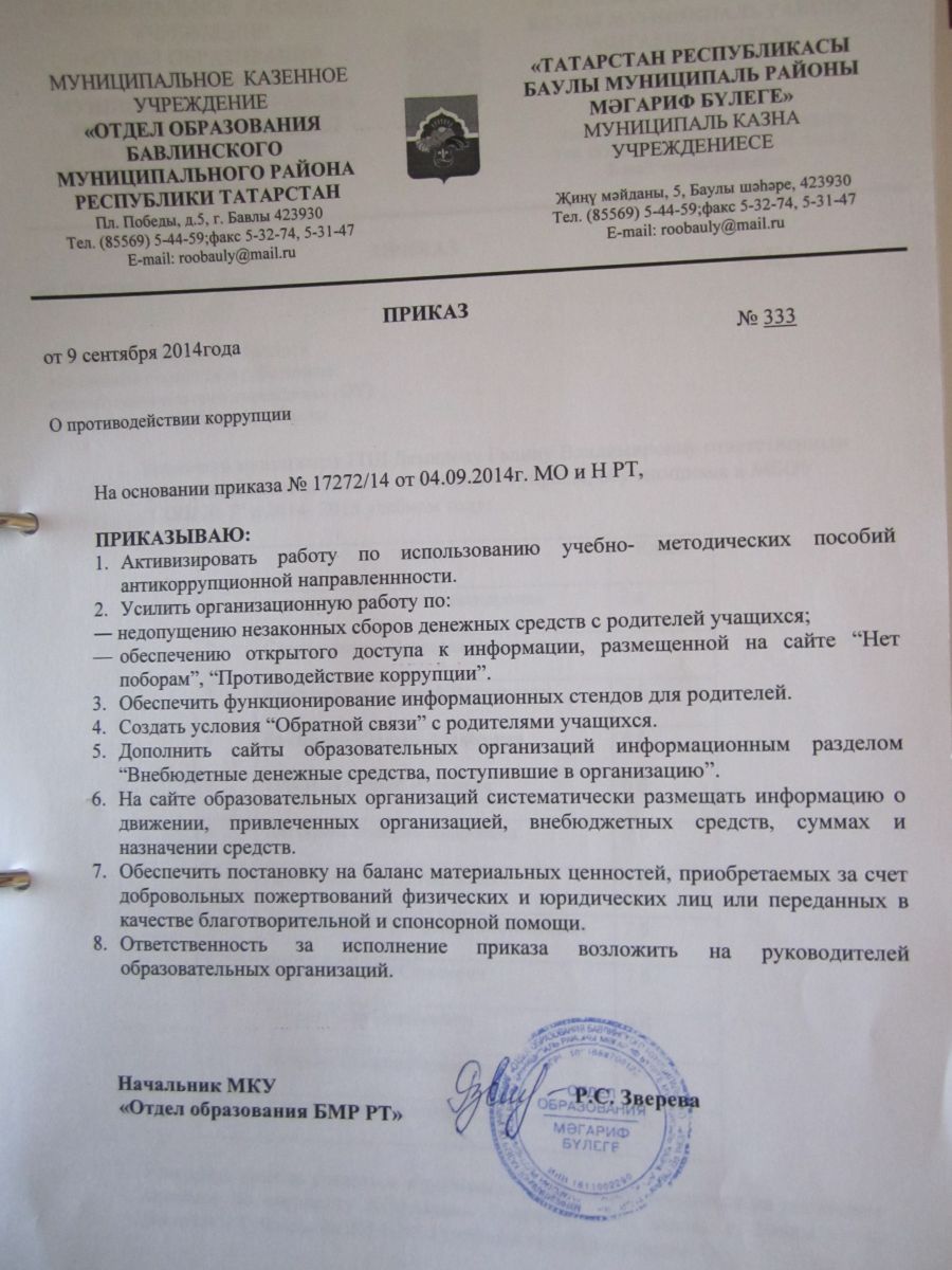 Приказ №333 от 04.09.2014 г "О противодействии корупции"