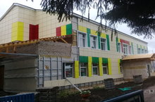 Выполнены следующие работы:1.Демонтаж входных групп,дверных блоков, полов, отопления;2.Штукатурка стен, засыпка отмостков;3.Замена окон -50%;4.отделка фасада здания-35% -