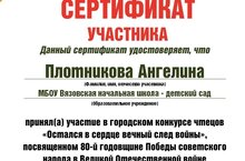 В рамках Года Защитника Отечества ученица 1 класс Плотников Ангелина, приняла учатие в конкурсе чтецов, организованном Центральной библиотекой г. Бугульмы «Остался в сердце вечный след войны», посвященный 80-й годовщине Победы в Великой Отечественной войне. Желаем на останавливаться на достигнутом, всегда двигаться вперед, покорять любые вершины.