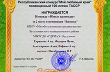 Подведены итоги Республиканского конкурса, проводимого ГБУДО РЦВР совместно с МБО ДО Центром детского творчества города Азнакаево. «Мой любимый край», посвященный 100-летию ТАССР. Педагог дополнительного образования, руководитель объединения «Юные краеведы» Насибуллина М.Г. вместе со своими воспитанниками Гариповой Алсу, Федоровым Яковом, Асылгареевой Алией, Вафиной Алсу приняли участие в видео конкурсе, в номинации «Визитка», заняв 2 почетное место. Молодцы!!!