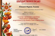 Воспитанники объединения ТКД педагога доп. образования Поповой М.Л. приняли участие в I Всероссийском конкурсе чтецов, приуроченном к Году памяти и славы "Строки войны", который проходил с 6 ноября по 7 декабря 2020 г. Зайцева Анна - заняла II место, Лихачёваа Арианна - III место. Попова Марина Львовна была награждена благодарственным письмом.